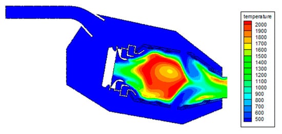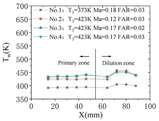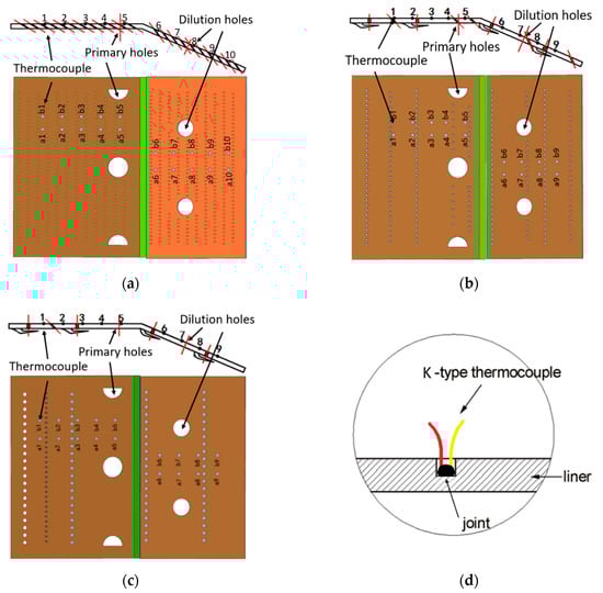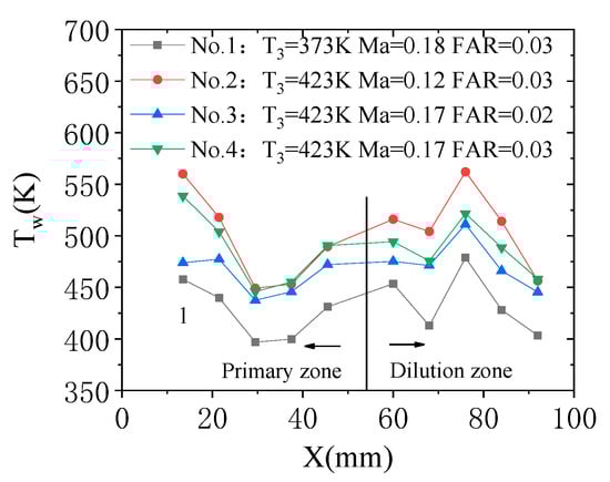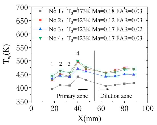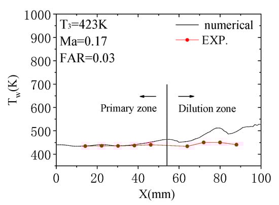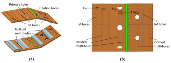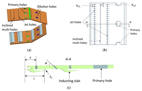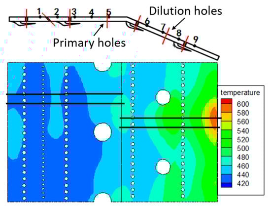 Figure 9. Considering the effective length of the impingement-film and the limitation of the geometric dimensions of the flame tube, two rows of jet holes are arranged on the wall of the primary zone and the dilution zone, and several rows of multi-inclined holes are arranged upstream of the inducting slab, respectively. According to the results of the references [