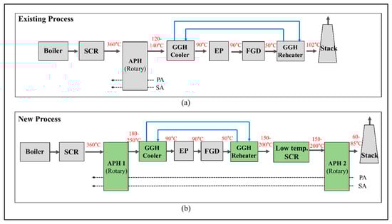 Schematic diagram of the new process for a coal-fired power plant with a low-temperature selective catalytic reduction (SCR): (a) existing process and (b) new process.