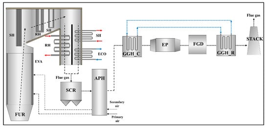 Figure 2 presents the material flows and components of the target power plant, consisting of the boiler system and post-gas flow system. In the boiler system, there is a series of heat exchangers, including a once-through evaporator (EVA) in the furnace, an economizer (ECO), three superheaters (SH), and two reheaters (RH). The post-gas flow system is composed of the SCR, rotary type APH, GGH_C, electrostatic precipitator (EP), FGD, and a tube-type GGH_R. The flue gas generated by combustion in the furnace is discharged from the boiler after transferring heat to the heat exchangers. In the target boiler, the convective heat exchanger section has a 2-pass gas flow. The discharged flue gas flow from the boiler flows into the post-gas flow system. Nitrogen oxides in the flue gas are removed by the SCR and the flue gas transfers its heat to the air in the APH. The flue gas is then cooled to conform to the optimum operating temperature of the FGD in the GGH cooler. The cooled flue gas flows into the EP and FGD, where dust and sulfur dioxide are removed, respectively. Finally, to disperse the flue gas from the stack to the atmosphere, the flue gas is reheated in the GGH reheater and is discharged to the stack.