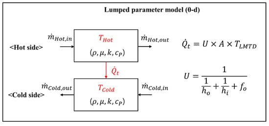 Figure 3 presents a model description of a lumped parameter model for a heat exchanger block. The heat exchanger block model is divided into the hot side of the flue gas and the cold side of the water-steam or air, where each side is connected via heat transfer. In each material side of a heat exchanger block, we define the flow rate, pressure, temperature, and properties, such as the density, specific heat, thermal conductivity, and viscosity. The heat transfer rate between the hot and cold sides is closely related to these flow properties for each material side. Therefore, to obtain the flow parameters, such as the mass flow rate, temperature, and pressure, we must solve the mass, momentum, and energy balances by considering the heat transfer interaction between the hot and cold sides.