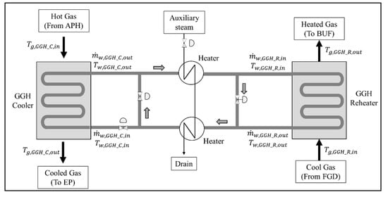 Figure 4 shows the flow diagram of the flue gas and water in the heat exchange system, including the GGHs. The main purpose of the GGH is to match the required temperature of the cooled gas of the GGH_C and the heated gas of the GGH_R. To control the flue gas temperature of each GGH, the water inlet conditions are controlled according to the flue gas flow conditions for each load. During the operation of the GGH, as the water circulates through the GGH_C and GGH_R, the outlet conditions of one should be nearly identical to the inlet conditions of the other for efficient and stable operation. However, when the required amount of heat in the GGH_C and GGH_R vary because of changes in the operating conditions, the inlet flow rate of the water must be controlled via the flow valve while the inlet temperature must be increased and decreased via the heater. Therefore, based on the process simulation, we must derive new operating conditions for each load to conform to the required flue gas temperature of the GGH_C and GGH_R in the new process. The model will allow us to suggest the degree of the flow control of the valve and the required heat duty of the heater.