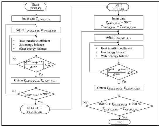 Based on the assumptions above, Figure 5 shows the derivation of the GGH operating conditions for the new process. The calculation process for the GGH_C to obtain the new operating conditions is as follows. We set Tg,GGH_C,in to the calculated exit temperature of the APH 1. Then, Tw,GGH_C,in and were initialized to calculate the energy balance of the GGH_C. The calculations of the HTC and energy balances of the flue gas and water in the GGH_C were iterated until they satisfied the convergence conditions shown in Figure 5. The variables () of the convergence condition were the exit temperature of the flue gas and water. When the convergence condition of the energy balance for the GGH_C was satisfied, Tg,GGH_C,out and Tw,GGH_C,out were obtained. The above calculation process was repeated while adjusting Tw,GGH_C,in and until Tg,GGH_C,out was approximately 90 °C. Once the required flue gas temperature of the GGH_C was satisfied, the calculation of the GGH_R was performed to obtain the new operating conditions for the GGH_R. Here, Tg,GGH_R,in was entered as the FGD outlet temperature of 50 °C, such that Tw,GGH_R,in receives Tw,GGH_C,out, which was obtained from the calculation of the GGH_C. In the calculation of the GGH_R, was initialized. The calculations of the HTC and energy balances of the flue gas and water in the GGH_R were iterated until they satisfied the convergence condition shown in Figure 5. When the convergence condition of the energy balance of the GGH_R was satisfied, both Tg,GGH_R,out and Tw,GGH_R,out were obtained. The above calculation process was repeated while adjusting until Tg,GGH_R,out was in the range of 150 to 200 °C and Tw,GGH_R,out was near Tw,GGH_C,in, which is the adjusted value of the calculated GGH_C. These calculation processes were performed for each load. Finally, the new operating conditions were derived through these calculation processes. Therefore, we can determine the degree of the valve flow control and the required heat duty for the heater in the GGH.