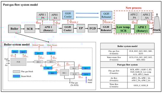 Process simulation model outline of previous and new processes in the target power plant (including post-gas flow and boiler system models).