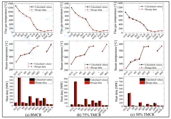 Representative simulation results (flue gas temperature, steam temperature, and heat duty) for mass and heat balances in the target power plant system, using the load conditions: (a) BMCR, (b) 75% Turbine Maximum Continuous Rating (TMCR), and (c) 30% TMCR (black color indicates calculated values, red color indicates design data).