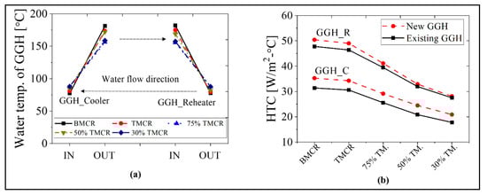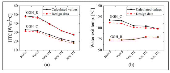 The (a) HTC and (b) exit temperature of the water in the cooler of the gas–gas heater (GGH_C) and the reheater of the gas–gas heater (GGH_R) using the five load conditions (black color indicates calculated values; red color indicates design data).