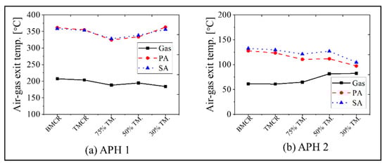 - The energy balances for the APH 1, APH 2, GGH_C, and GGH_R were calculated in the post-gas flow system model. The exit temperature of the FGD has a constant value based on the design data of 50 °C for all load conditions.
