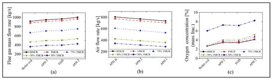The calculation results for the APH 1 and APH 2 in the new process are as follows. Figure 9 and Figure 10 show the exit temperatures of the flue gas and air, the mass flow rate of the flue gas and air, and the oxygen concentration. The calculated exit temperatures of the flue gas are 180–207 °C, which is within the range of 180 to 250 °C, as proposed for the new process concept in Figure 1. Therefore, the heat energy can be assured to conform to the increased heat that is transferred to the water in the GGH_C. The exit temperature of the flue gas in the APH 2 ranges from 60 to 82 °C, which is within the target value range of 60 to 85 °C in the new process. The primary and secondary air flows through the two APHs and enters the furnace at a temperature of 320 to 360 °C, which is similar to the values of the existing process, such that there is no loss in the boiler thermal efficiency. Meanwhile, as shown in Figure 10, since the new process uses two APHs, there is an increase in the amount of air leakage, increasing the flue gas flow rate. This leads to an increase in the oxygen concentration at the exit of the stack.