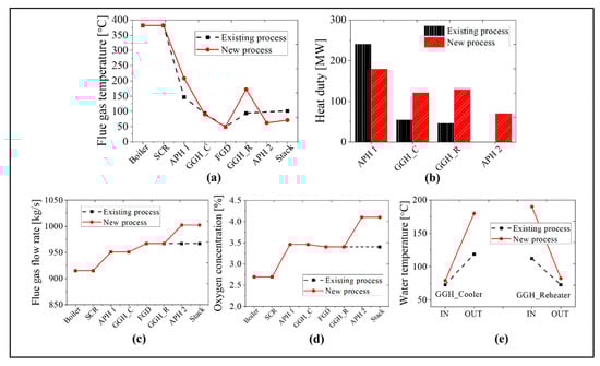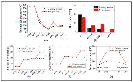 Comparison results between the existing and new processes at the BMCR load condition: (a) flue gas temperature, (b) heat duty, (c) flue gas flow rate, (d) oxygen concentration, and (e) the water temperature of the GGH.