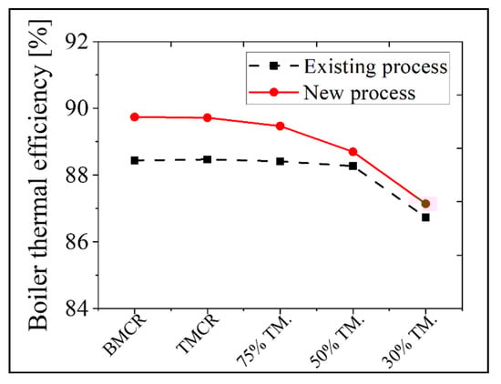 A comparison of the results for the thermal efficiency of the boiler in the existing and new processes based on the load conditions.