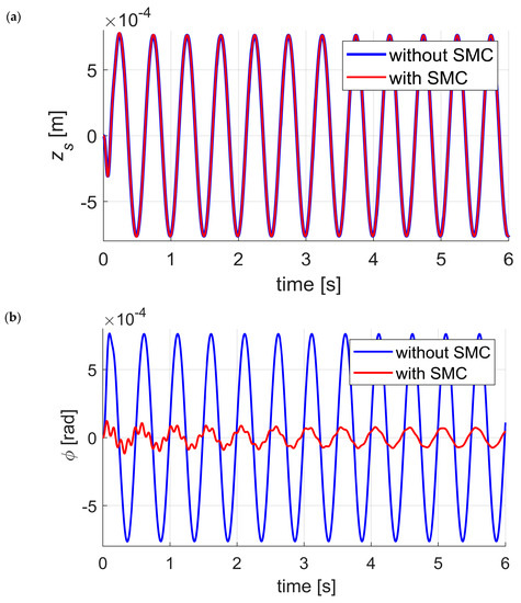 The increase of the amplitude of exciting signals to did not indicate the impact of the SMC on the reduction of vertical vibration which is in line with assumptions made during the synthesis of the SMC. As the time courses of body vertical displacement—with and without SMC—coincide, they are not included in the paper.