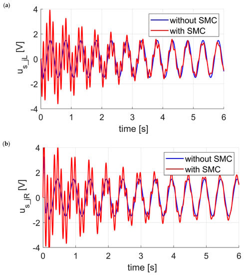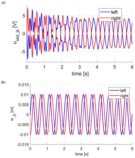 As one can see in Figure 4a designed SMC is not dedicated to reducing vertical vibration—presented curves coincide. The amplitude of variable (vehicle roll) without SMC was , and with SMC was reduced to (Figure 4b). LQR controllers related to individual struts were active in both cases. LQR controllers of individual struts ensure the reduction of vertical vibration while at the same time minimal energy requirement is demanded. This requirement can be seen on quality indicator (34). The use of SMC in the addition control layer allowed the roll to be reduced 12 times for the exciting signals. The efficiency of roll reduction is defined by the selection of sliding surface parameters. Figure 5 presents the control signals for the left and right strut (including the signals generated by the LQR controllers). Control signals are within the permitted range from to . Analyzing Figure 5a,b it can be noticed that the control signals are distorted, and their values decrease with the system approaching the sliding manifold in the case of working SMC.