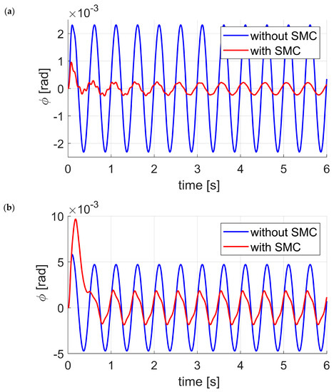 Figure 7 presents time courses of the angle for the exciting signals frequency of and amplitudes of and . In both cases, limit cycles can be noticed with the system approaching the sliding manifold. In case of the disturbance signal amplitude of (Figure 7a) the maximum value of the signal angle with no SMC was , and with SMC. The tenfold reduction of the vehicle roll was achieved. In case of amplitude of disturbance signal (Figure 7b)—after reaching the sliding manifold—it can be noticed that signal is strongly distorted from the sine wave. The maximum values of angle charts for limit cycle with no SMC and with SMC are , respectively. The 2.5-fold reduction of vehicle body roll was achieved in this case. Decreasing of roll reduction efficiency is a result of control signals saturation. This is also the reason why the changes of the angle signal is strongly deflected Figure 7b. Figure 8 presents the time courses of the left and right strut control signals for various amplitudes of disturbance. This figure shows (green color) periodic saturation of the left and right strut control signals. Comparison of these signals is additionally shown in Figure 9b.