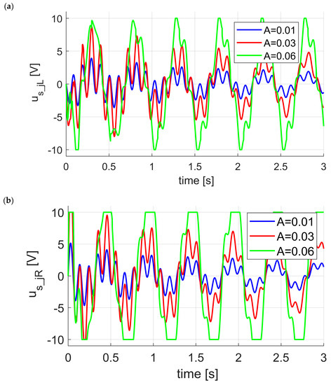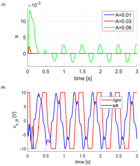 Figure 9a presents values of the waveform function describing the sliding surface for various amplitudes of disturbance signals. In the case of amplitudes, , the control system always remains on the sliding surface (blue color), and the strut control signal remains within the permitted range (blue color Figure 8). When the amplitudes of excitations increase up to , the system is taken out from the sliding surface and then, after about 0.1 s, the system trajectories return to the surface. These results from the fact that the right strut control signal becomes saturated at time and (Figure 8b). In case of amplitude, the control system trajectories periodically leave the sliding surface (green color Figure 8 and Figure 9a) because the strut control signal becomes periodically saturated (green color Figure 8 and Figure 9b). In addition to saturation of this signal, one can see the same phase shift as excitation. The struts control signals after reaching a sliding manifold are within the permitted range.