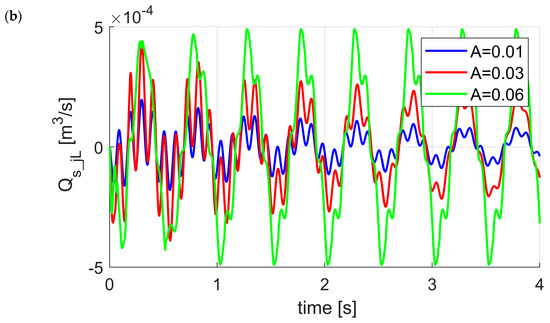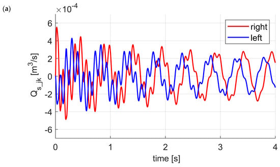 Comparison of the flow rates in servovalves controlling both struts actuators for excitation parameters was presented in Figure 10a. The maximum value of flow rate for left strut () is less than for right strut (). It is due to the assumed initial conditions, developed model of disturbances (Figure 6b) and the transient states which are the result of them. Values of the flow rates for left and right strut are similar when the state trajectory is approaching the limited cycle and are equals , , respectively. Comparison of the left strut actuator flow rates in servovalve for different excitation amplitudes is presented in Figure 10b. As one can see the higher amplitude of excitation involved the significant increase of the flow rates. Values are important during the design of the hydraulic system and especially on the stage of servovalve selection. The maximum values of flow rates for excitations amplitudes and are equals ,, , respectively.