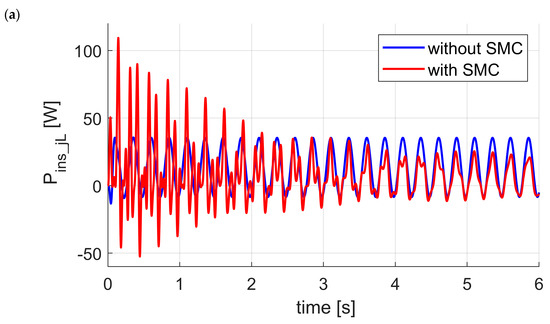 In Figure 11a comparison of instantaneous power used by left strut actuator with and without SMC are presented. The time courses of the instantaneous power without SMC show that their values are similar for whole chart. Maximum values equal and . However, for system with SMC values of instantaneous power was significantly higher at the beginning of the chart . After reaching limited cycle system with SMC need less power than system without SMC. It is due to the fact that the addition of the SMC responsible for roll control involves the optimal work of the LQR. These controllers were synthesized for the assumption of independent operation of struts.