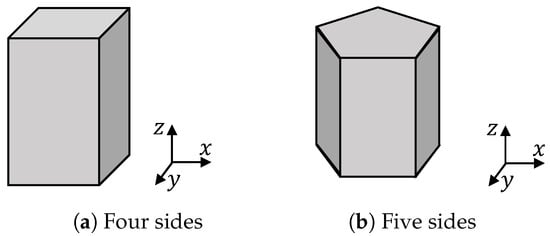 Now, we model the buildings. In this paper, each building is modelled as the smallest prism to enclose this building. Each prism has two parallel and congruent bases and a number of flat sides that are perpendicular to the -plane; see Figure 2. Each prism is characterized: , and h. is a -by-2 matrix and is a -by-one vector. They determine the shape and size of the base. h is a scalar indicating the height of the prism. For a point , if it is inside a prism, (7) holds: