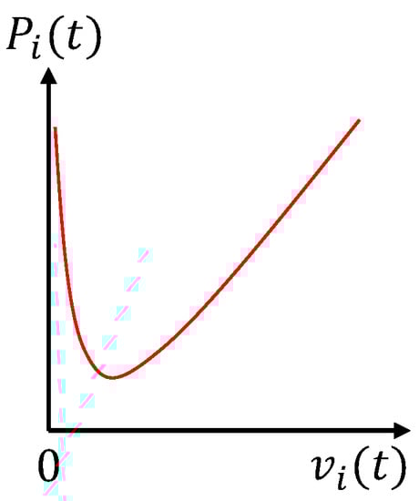 Suppose that we have a team of solar-powered UAVs labelled . We consider that these solar-powered UAVs fly at a fixed altitude z in an urban area to conduct some missions. For UAV i, let be its position in the ground frame at t, be the horizontal heading angle with respect to the x-axis; and, and be its linear and angular speeds, respectively. The motion of UAV i can be described by the following equations [28,29]: