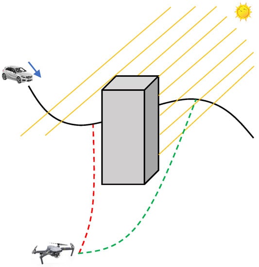 With this function, we can also test whether a UAV and the sun have LoS. To this end, the sun’s location needs to be known. Let V, a unit vector, denote the sunlight direction. With V, we can imagine that the sun is at , where the parameter takes a large value so that the sun is far from the point p. We need to place the sun at a relatively far position. The reason is that we use the line segment to verify whether two points have LoS. When the sun is placed closely to the point p, we may not obtain the correct verification.