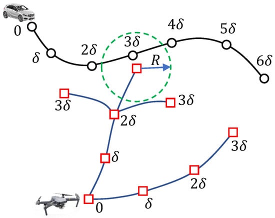 This paper focuses on the scenario where the number of UAVs is not enough to persistently monitor the targets, so a periodical surveillance is conducted by the UAVs. As the targets are moving in the considered region, the problem is more relevant to the time-dependent TSP [20] and the moving-target TSP [21,22]. In the time-dependent TSP [20], the common setting is to find the shortest tour for the salesman in a graph with time-dependent edges. In the moving-target TSP [21,22], the targets are assumed to move with a constant speed along a fixed direction. The problem considered here is different from them. Firstly, the targets move along some trajectories, so that their speeds and moving directions may change with time. Secondly, the existence of buildings in the urban environment requires the UAVs to avoid collision with the buildings. Thirdly, the UAVs need to harvest energy from the sun to enable the UAVs to operate in the given time period. However, each path depends on the UAV’s initial position, the buildings’ positions and the target’s trajectory, which is challenging to be known in advance. Thus, both the moving-target TSP and the time-dependent TSP cannot be applied to address the problem that is considered in the paper.