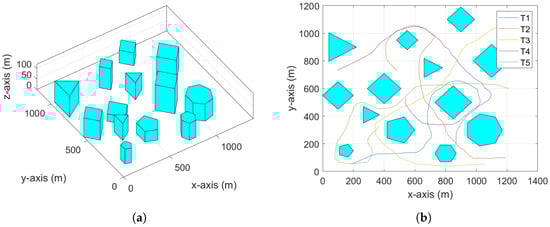 We show the performance of the proposed navigation algorithms. An urban environment is constructed in MATLAB with various buildings, see Figure 7a. The heights of the buildings are between 30 to 120 m. Five targets move on the -plane in the environment, and their trajectories are shown in Figure 7b.