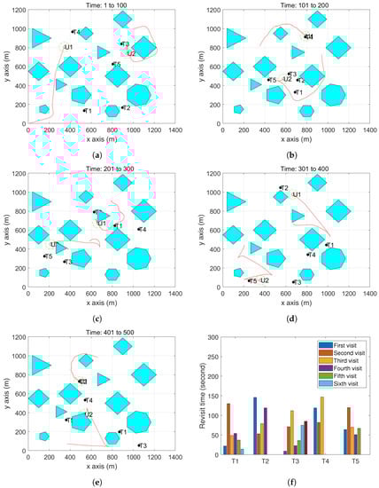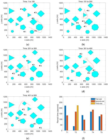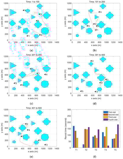 301 and 400 s. (e) The UAV trajectory between 401 and 500 s. (f) The revisit time of each target during