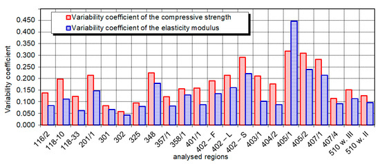 Variability coefficient of the compressive strength and the elasticity modulus of rocks in the massif in the analyzed regions.