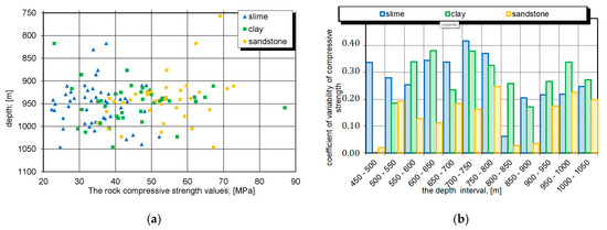 Figure 3 presents an example of the distribution of the compressive strength of sandstone forming one top layer of a coal seam [36], while Figure 4 presents the distribution of the compressive strength variability of sandstone, mudstone, and claystone constituting the same layers depending on the depth. The presented diagrams indicate that there is no relationship between the strength of the rocks forming the analyzed layers and their depth.
