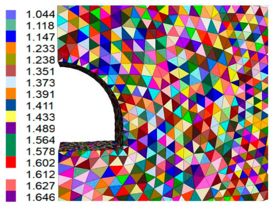 In the model with the assumed variability coefficient equal to 0.25, in addition to the elements in the immediate vicinity of the excavation, individual elements located several meters away from its contours were plasticized (Figure 8e and Figure 9e).