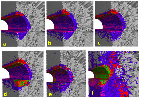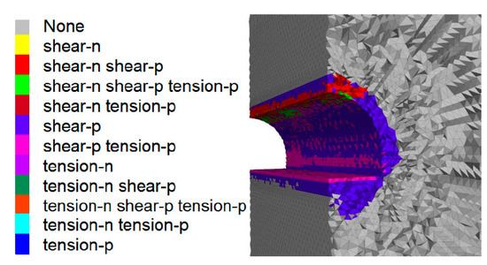 The results of numerical simulations in the form of plasticization zones should be interpreted as zones in which the stress state has reached its limit value, defined by the applied strength condition. In the results presented in Figure 7, Figure 8 and Figure 9, the plasticization zones resulting from the reaching of tensile and shear strength were marked with various colors. Due to the iterative calculation method, the calculation results also allow the determination of whether the limit state is reached now, it is in the current calculation step (shear-now, tension-now), or was reached in past iterations (shear-past, tension-past).