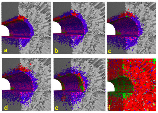 The plasticization zones obtained in the reference model (variant 0) include the rock mass in the vicinity of the modelled excavation at a distance of up to 0.8 m in the roof, 1 m in the side wall, and 1.7 m in the floor, while the plasticization occurred mainly as a result of reaching the shear strength limit (Coulomb–Mohr strength condition met) in both the current (shear-now) and past iterations (shear-past). The tensile strength (tension-past) was exceeded only in the elements located directly on the outline of the excavation.