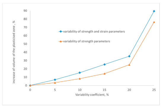 The influence of the dispersion of mechanical parameters can also be inferred from the aspect of the total volume of all plasticized elements generated in individual variants, which is presented in the form of a diagram in Figure 10. As shown in the diagram below, the volume of plasticization zones increases from 200 m3 in the case of rock mass with homogeneous parameters to close to 380 m3 with a variability coefficient of strength and deformation parameters equal to 25%.