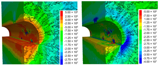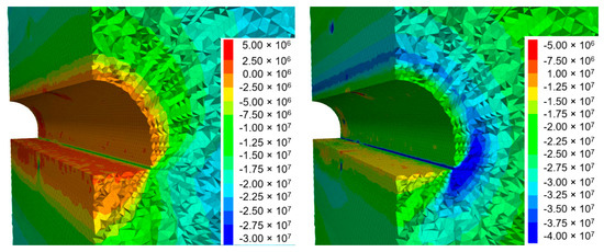 Much more pronounced disturbances in the stress distribution occur in the case of the model with a random distribution of both strength and deformation parameters (Figure 12), where compressive stresses exceeding 40 MPa can be observed in places on the sides of the excavation and the tensile stress zones generated in their vicinity reach up to 5 MPa.