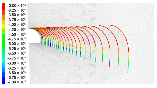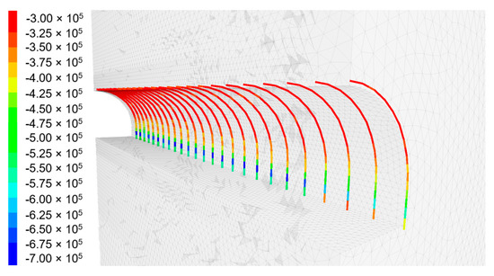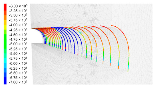 The bar elements used in the model, mapping the arches of the supports, were subjected to various loads depending on the calculation variant. In the case of the reference model (Figure 13), the distributions of axial forces in individual support arches along the entire length of the modelled excavation are similar and reach maximum values of up to 700 kN in the bottom part of the supports.
