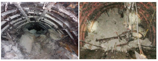 Spots with increased values of axial forces correspond to regions of stress disturbances and zones of increased displacements. Locally occurring increased loads on the supports, in the absence of additional protection, may result in the destruction of the supports and the collapse of the roof rocks, as shown in Figure 16.