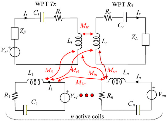 Let us consider the n-coils active shielding configuration used to mitigate the magnetic field produced by a two-coil WPT system (i.e., Tx and Rx coils). The considered configuration can be modeled by n + 2 equivalent circuits that are inductively coupled together, as shown in Figure 2 [23].