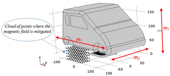 The interest is focused on minimizing the magnetic field in critical zones accessible to humans such as in Region 2 beside the EV. To this purpose, we consider this region as a cloud of m points beside the EV close to the ground, as shown in Figure 3. At each point Pj = (xj, yj, zj) with j = 1,…,m of the cloud, the transfer functions bk(P) given by (11) is calculated for all coils, i.e., , assuming a unit current excitation Ik = 1 A. Then, the Gradient Descent [25] optimization technique is used to find out the values of the active coils currents which minimize the magnetic field in the cloud of points as described in the following.