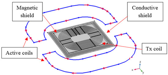 Four active coils are used to mitigate the magnetic field generated by the WPT coils: two on the transmitting side and two on the receiving side (see again Figure 4). The active coils are geometrically designed following the guidelines described in [24] to obtain good shielding capacity without degrading the WPT performances.