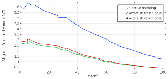The optimization procedure provides the vector [Va] containing the voltage source excitations of the active coils. Applying these excitations to the circuit shown in Figure 2 for the two considered test cases #1 and #2, the coil currents are obtained. Thus, it is possible to impose these currents as sources of the magnetic field and to calculate the field distribution by COMSOL using the MQS equations solver. The magnetic field beside the EV is calculated along the red dotted measuring line shown in Figure 4. The comparison of the results obtained in test cases #1 and #2 is shown in Figure 9. The measuring line is located beside the EV parallel to the x axis, at a distance of 110 cm from the center of the coil along the y axis and equidistant from the primary and secondary coil on the z axis. It is worth noting that the magnetic field is significantly reduced in both test cases #1 and #2, and the field mitigation is also very similar. Therefore, the configuration of test case #1 is more convenient as it is based on only two active coils in the ground assembly instead of the four coils in test case #2. A smaller number of active coils leads to a reduction in complexity, cost, and losses.