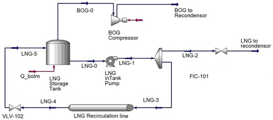 Based on these assumptions and the selected parameters (Table 6) the steady rate of heat leakage is calculated from the model (Figure 2). It is worthwhile to mention now that BOG from the LNG tank is contributed by heat ingress into the tank and the recirculation lines, as well as the in-tank pump duty incurred due to recirculation. For a fixed recirculation rate a small and continuous amount of heat is added to the tank which can be ignored in comparison with tank heat leakage, and the heat generated by the in-tank pump is taken away from the tank by sending out LNG [43]. Thus, the main factor contributing to the BOG generation from the tank is ambient heat leak. The Aspen Hysys tank module along with some theoretical adjustments reported by Khan et al. [7] is utilized for heat leak modeling. The correctness of the model is validated by Effendy et al. [11].