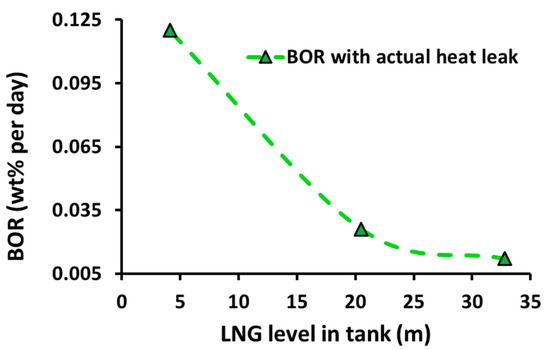 BOG obtained from the (Aspen Hysys tank module using all the parameters given in Table 1, Table 2, Table 3, Table 4 and Table 5) the heat leak to the liquid ( is plugged in Equation (1) to obtain BOR. A problem in the definition of BOR is that it considers the worst case of heat leakage for BOG calculations [20]. The worst case is a situation involving heat leakage in a tank with a very low liquid level. However, the tank operates from high to low liquid level and is not always at a low level. This makes BOR a function of liquid level in the tank. This issue is discussed in Section 3.1 by considering the three cases of 80%, 50%, and 10% liquid level in the tank.