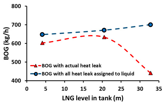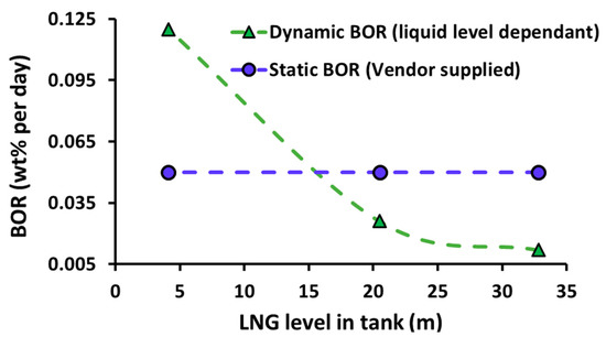 BOR (wt%) corresponds to the LNG vaporized per day of the total LNG mass present in the tank. Most often, the designer uses a fixed value of 0.05 wt% (on the gross volume of the LNG inner tank and pure methane) for the maximum tank volume as the BOG generation rate. This number is only reliable when the total amount of heat leakage into the tank is constant, irrespective of the actual LNG volume inside the tank, as evident from Figure 3 (i.e., 8% increase of the total heat ingress in the tank, and confirms that the heat leakage in the tank is practically constant). However, this definition assigns all the heat leakage of the tank to the liquid phase and ignores the distribution of the heat into the vapor and liquid, and the effect of change of the liquid level on the BOR and BOG, which is addressed in this section.
