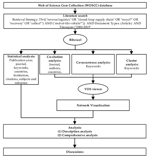 However, there are few literature reviews on the analysis of ELVs reverse logistics from both qualitative and quantitative perspectives. Additionally, none of the researchers combined the complex network analysis and bibliometric analysis to systematically and deeply analyze the relationship between the publications of ELVs reverse logistics. Therefore, it is incredibly necessary and essential to use the network analysis method to study the related literature of ELVs reverse logistics. Consequently, this research attempts to fill this gap. In general, this paper aims to determine the research focus of ELVs reverse logistics through bibliometric analysis, and provide help for researchers in further research and analysis. This paper has the following main objectives: (1) evaluating the progress and trends of research on ELVs reverse logistics recent years; (2) revealing the relationship of academic cooperation, distribution of countries/regions, the characteristics of journals, core authors, subject categories and institutions; (3) conducting the mutual citation of literature and listing the distribution of keywords to elaborate the intellectual structure and find research hot points; and (4) providing potential research directions with sustainability for future studies.