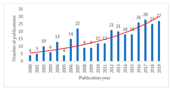 The evolution of the annual number of publications (ANP) between 2000 and 2019 is shown in Figure 4. Although the ANP appeared in a trough period from 2008 to 2011, it showed an upward trend overall. In particular, it accounted for 70% of the total in the recent 10 years. From the current trend, it can be predicted that the ANP related to the reverse logistics of ELVs will continue to proliferate, which indicates an increasing number of researchers will pay attention to the field. This study aims to explore the impact and development of reverse logistics of ELVs by analyzing popular journals, representative countries, influential authors, and topic distribution.