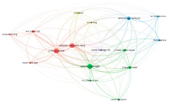 Table 2 and Figure 5 highlights the top 10 most famous journals and co-citation relations. Among them, the Journal of Cleaner Production, Waste Management, and Resources Conservation and Recycling are the core journals, accounting for 30.95% of the total number of papers. At the same time, the three journals are the most closely related, proving that their themes were significantly similar.