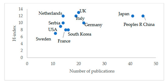 From 2000 to 2019, a total of 42 countries have publications related to the reverse logistics of ELVs. Figure 6 reveals 11 countries/regions that have published more than 10 papers, of which China (45, 15.31%) published the most papers, followed by Japan (41, 13.95%) and Germany (22, 7.48%), which is consistent with their highly developed automobile industry. The h-index of a country means that at most h papers have been cited for at least h times, which can accurately reflect the academic achievements of a country. Besides, these three countries also had high h-index (China, 12; Japan, 12; Germany, 10), which shows they attach importance to the domain of reverse logistics of ELVs, and promote the development and application of research in this domain. It is worth mentioning that the h-index of the UK (13) is the highest, followed by Italy (12) and the Netherlands (12), while their number of publications is relatively small. It indicates that the papers published in these three countries are of high quality, especially in the Netherlands, where 12 of the 14 articles published have been cited more than 12 times.