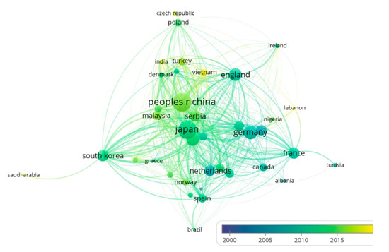 The literature coupling of various countries has been studied, as shown in Figure 7. The number of articles affects the size of the nodes, the width of the line indicates the strength of the relationship between countries, and the color of the node indicates the time when the field was studied initially. As can be seen from the image, Japan coauthored the most articles with China, Italy, Serbia and Germany. Similarly, the node representing Japan was located in the center of the image, with the strongest connection strength, indicating that Japan is the most active country. In addition, the largest node representing China was located near the center and had carried out more cooperation with Japan, Italy, Serbia, and England, which also shows China’s enthusiasm for academic cooperation. In terms of research time, Germany, the United States, and the Netherlands were the first countries to start research in the domain of reverse logistics of ELVs. Although China had the most significant number of academic papers, the research time was relatively short, which shows that Chinese scholars attached great importance to this domain in recent years.