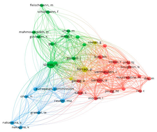 Author co-citation refers to that at least one article of two authors’ works appears in the same reference list, identifying the influential authors and their associations [32,33]. Considering the first author only and at least 20 citations for each author, Figure 8 shows the co-citation of authors through different clusters reported by distinct colors and the linkages among them. The node represents the author, and its size represents the number of papers published by the author. If the nodes have the same color or close distance, they are similar in research directions, forming a cluster. In addition, the co-citation relationship is represented by a link between two nodes. Thus, the most frequently cited author was Simic, who was closely related to Gerrard, Go, etc., forming a green cluster. Secondly, Santini was closely related to Vermeulen, Sakai, etc., forming a red ethnic group. The blue group was composed of Reuter, Nakamura, Graedel, and others.