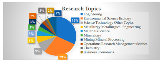 Figure 9 reveals that these 299 publications contained 32 subject categories according to WOS, of which the most common topic category was Engineering (32%), followed by Environmental Science Ecology (29%).
