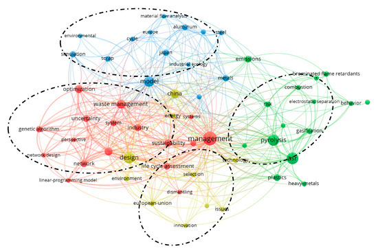 When excluding the keywords “reverse logistics”, “closed-loop supply chain”, “recycl *“, “recovery”, “collect *”, and “end of life vehicle *”, the most frequently co-occurring keywords were management (45), design (30), pyrolysis (29), model (21), and products (20). "*" represents any character group, including null characters. As shown in Figure 10, the mapped keywords were derived from VOS viewer’s previous analysis (including density, degree, concentration, and inclusiveness, which are typical indicators of the relationship among keywords). By using this method, the keywords were divided into four clusters through VOS viewer for further analysis: (a) modeling approach; (b) remanufacturing and materials recycling; (c) legislation-oriented research; and (d) automobile shredder residue recycling.