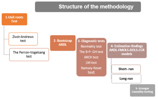 To test the causality relation in the short run, the Wald-testing technique (Statistics) was used to capture the significance of the linked estimated coefficient using the stationary variables. To test the causality relation in the long run, the t-test of the lagged ECT was employed. Figure 2 shows the summary of the methodological structure of this research.